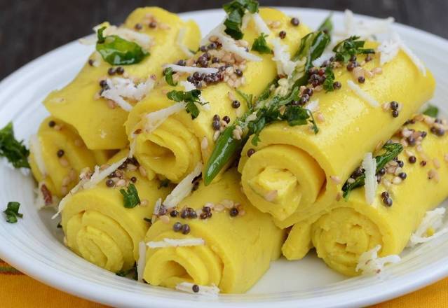 Khandvi, also known as Patuli, Dahivadi or Suralichi Vadi, is a savory snack in Maharashtrian cuisine as well as in Gujarati cuisine of India. It consists of yellowish, tightly rolled bite-sized pieces and is primarily made of gram flour and yogurt.
