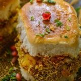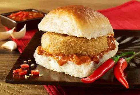 Vada pav, is a vegetarian fast food dish native to the state of Maharashtra. The dish consists of a deep fried potato dumpling placed inside a bread bun sliced with Schezwan souce